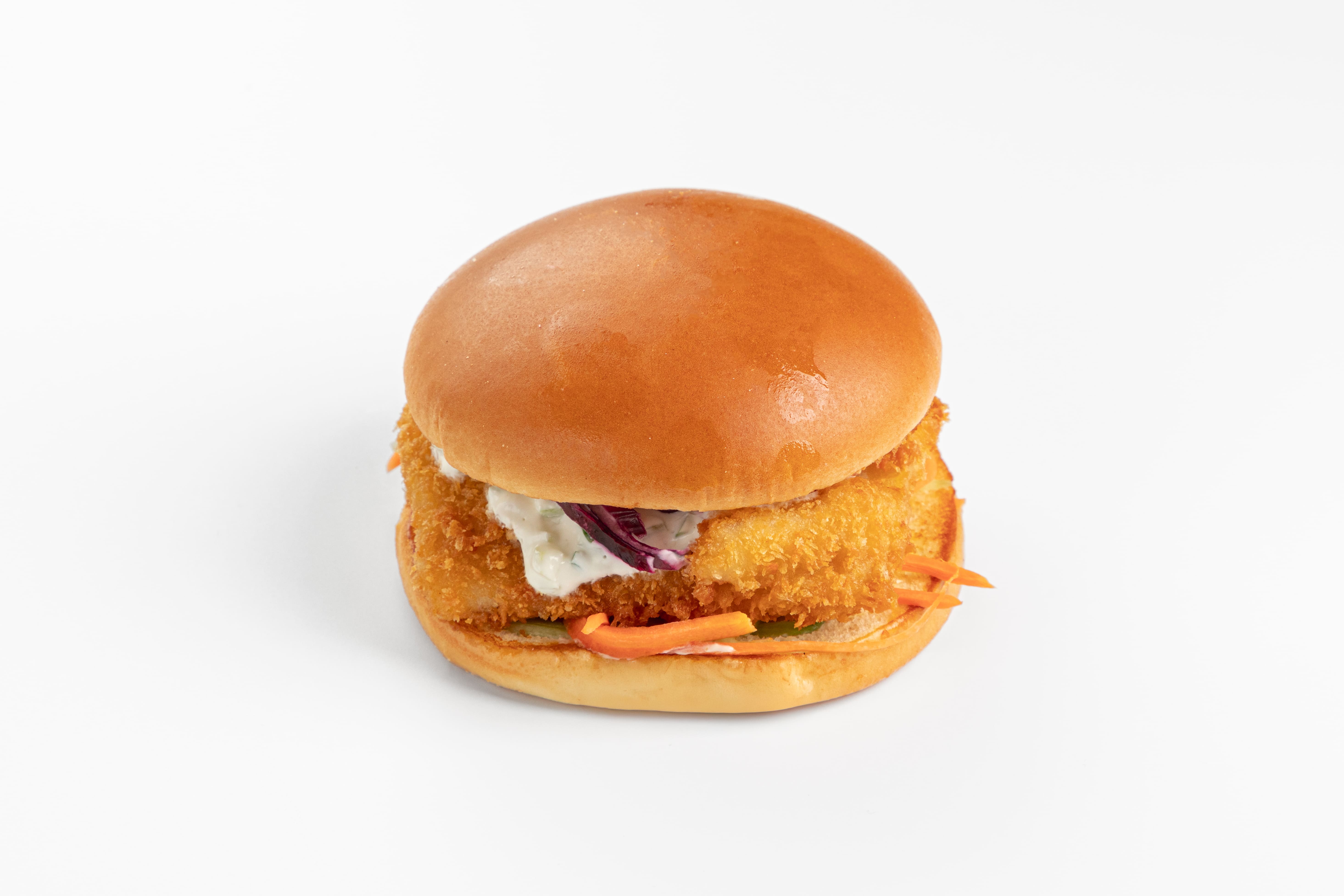 Хрустящее филе рыбы в кляре, морковь, огурцы, соус тадзики, красный лук, соус лимонный майо. Подается с картофелем фри